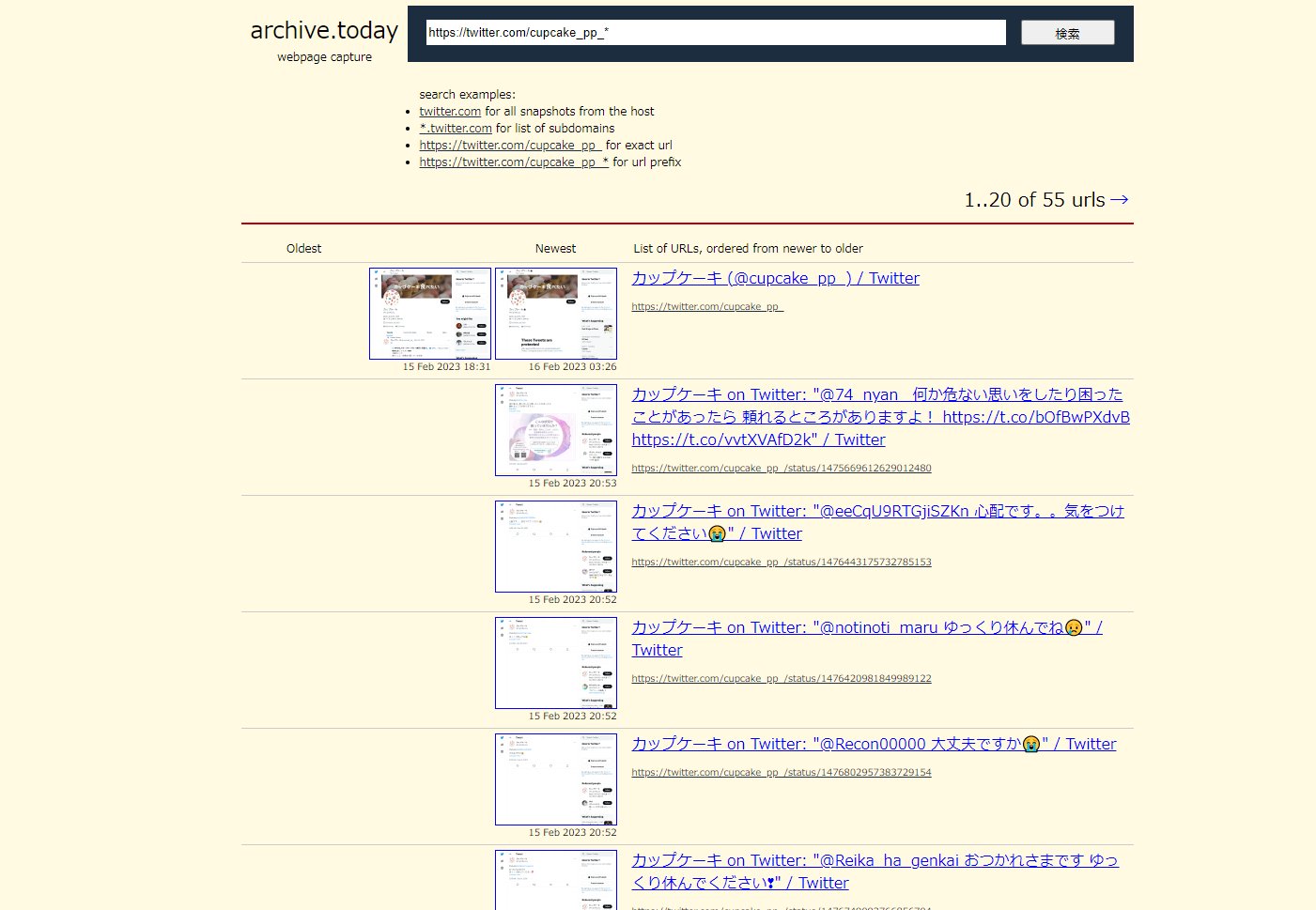 Twitterのプロフィール画面のURL末尾に*を入れればこれまでに取られた魚拓がみれるよ☆