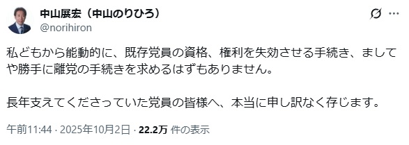 長年支えてくださっていた党員の皆様へ、本当に申し訳なく存じます。」