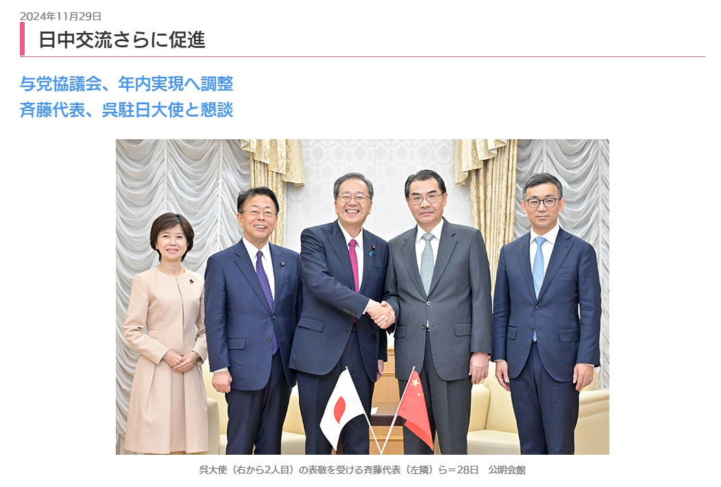 たとえば以下の読売の記事でも斉藤鉄夫が呉江浩駐日大使と会っていた事も含めて記事になっています。