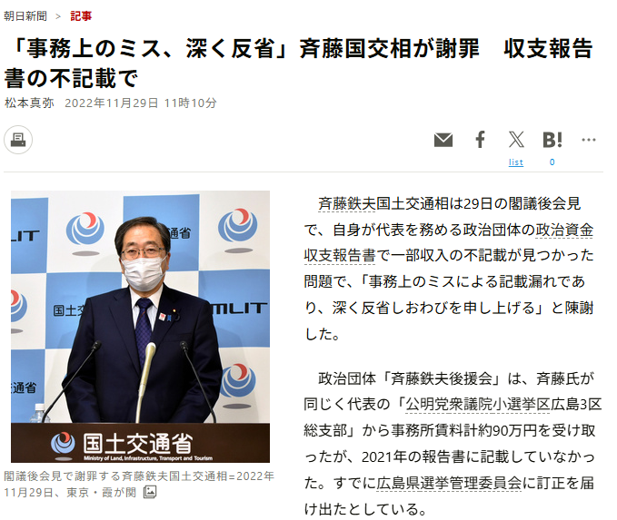 【斉藤国交相 資産報告書に記載漏れ…謝罪】