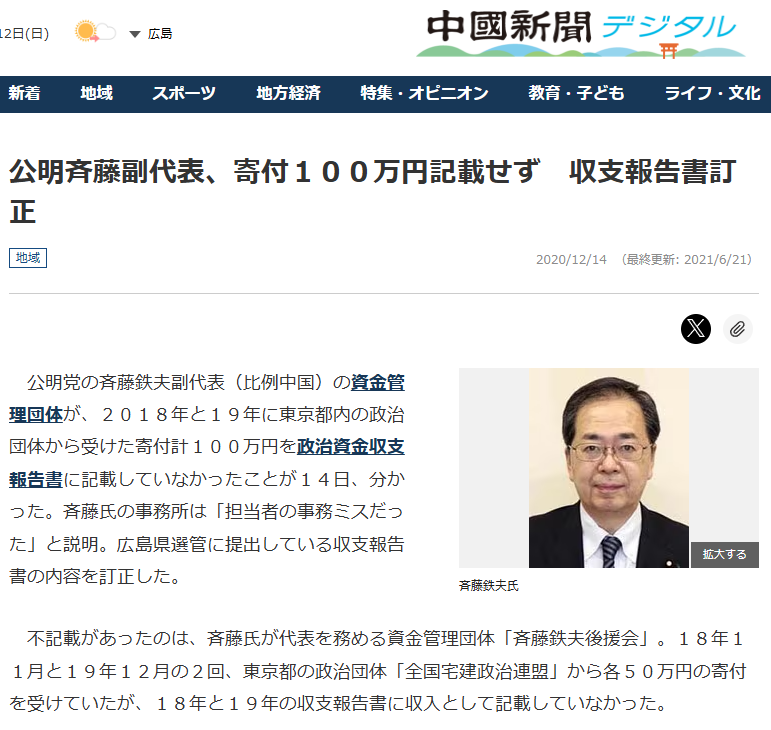 斉藤鉄夫代表の不記載は判明しているだけで4回。