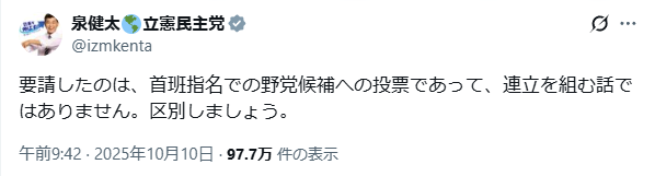 要請したのは、首班指名での野党候補への投票であって、連立を組む話ではありません。区別しましょう。