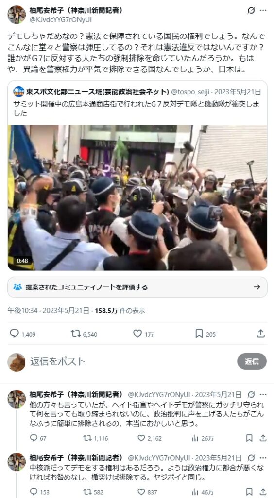 誰かがG7に反対する人たちの強制排除を命じていたんだろうか。もはや、異論を警察権力が平気で排除できる国なんでしょうか、日本は。