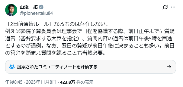 元霞が関職員として言わせて頂きたい??午前3時に高市総理の出勤が必要なのは、そもそも「(特に野党の)質問通告が遅い」からです。総理が前日にご覧になりたくても質問も答弁も完成していない。前々日の正午まで??という通告ルール、どれほどの野党議員が守ってますか?エビデンスは以下の人事院調査での切なる声をご覧ください。