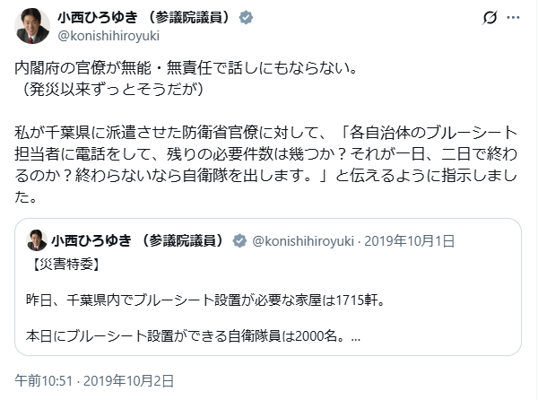 私が千葉県に派遣させた防衛省官僚に対して、「各自治体のブルーシート担当者に電話をして、残りの必要件数は幾つか?それが一日、二日で終わるのか?終わらないなら自衛隊を出します。」と伝えるように指示しました。