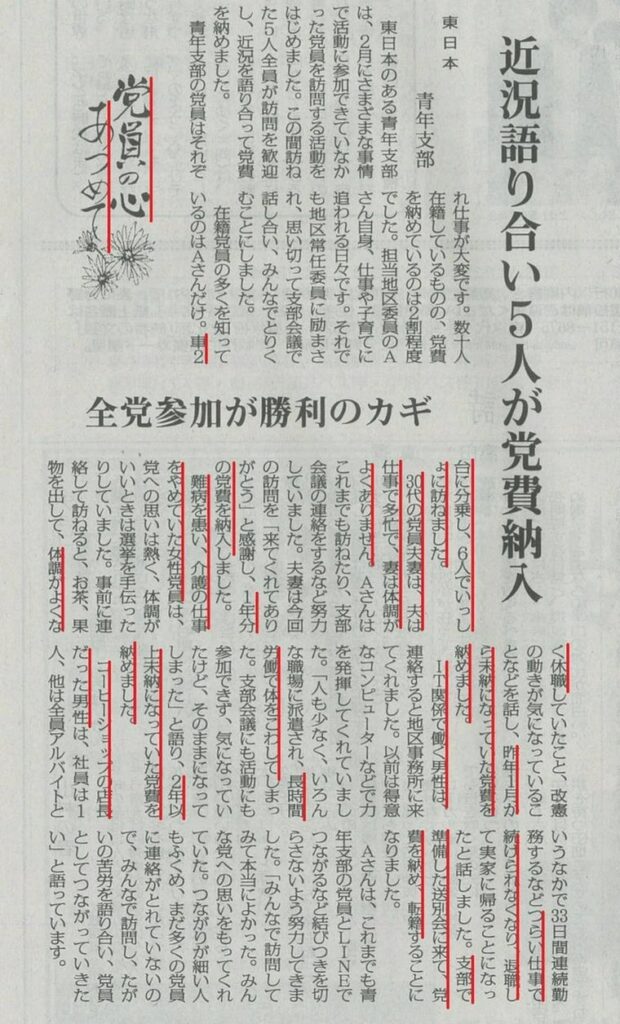 東日本のある青年支部は、2月にさまざまな事情で活動に参加できていなかった党員を訪問する活動をはじめました。この間訪ねた5人全員が訪問を歓迎し、近況を語り合って党費を納めました。