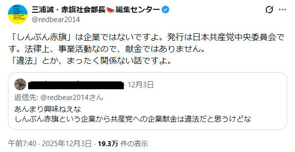 赤旗は民間企業の商品ではなく政治団体日本共産党の機関紙である