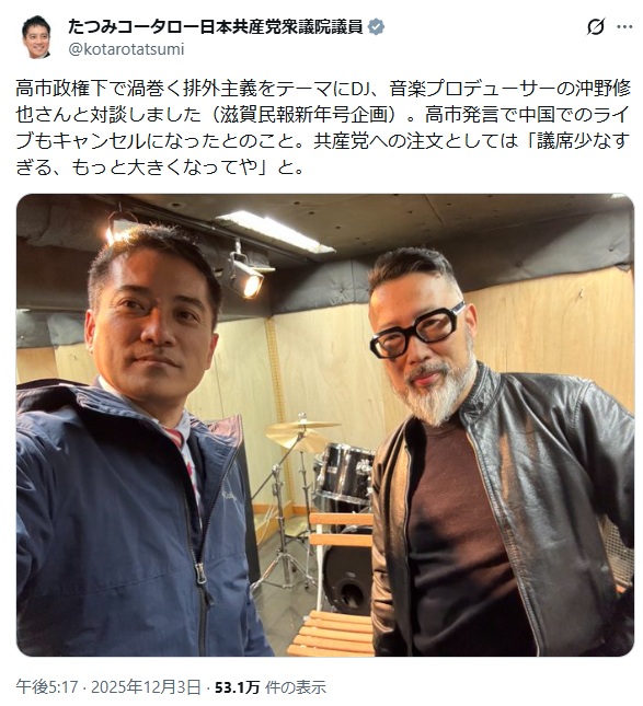 12月4日、自身のXを更新し、アーティストの海外展開を政府として後押しする考えを示した高市早苗首相。日本人アーティストの中国公演が相次いで中止になっている現状を受けての決意表明と思われるが、高市氏はさらに