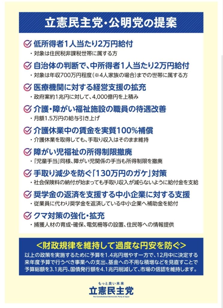 中所得者(立民と公明の独自基準で世帯収入が700万円程度以下の世帯に)1人当たり2万円給付