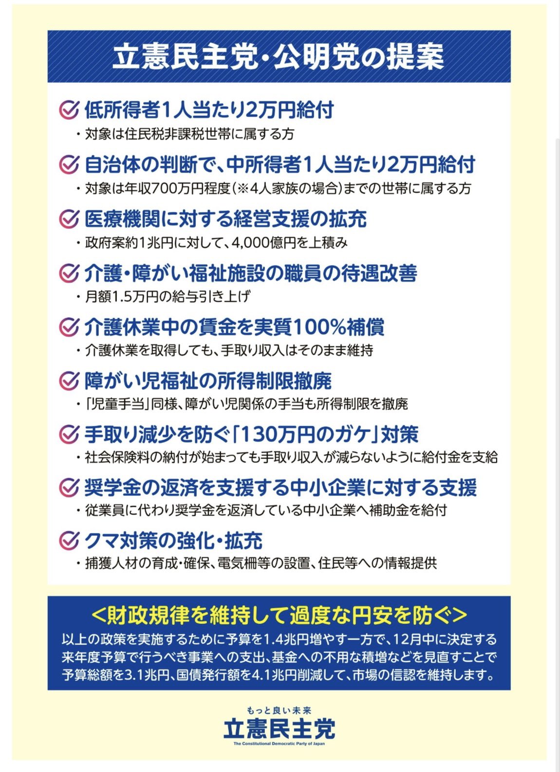 中所得者(立民と公明の独自基準で世帯収入が700万円程度以下の世帯に)1人当たり2万円給付