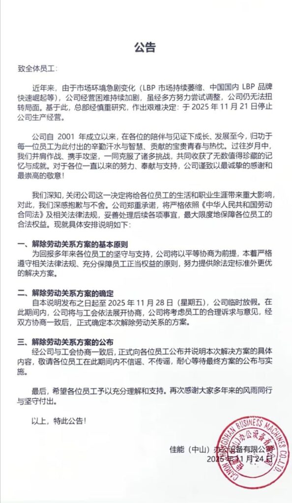 キヤノンが広東省中山にある工場の生産営業停止を発表。