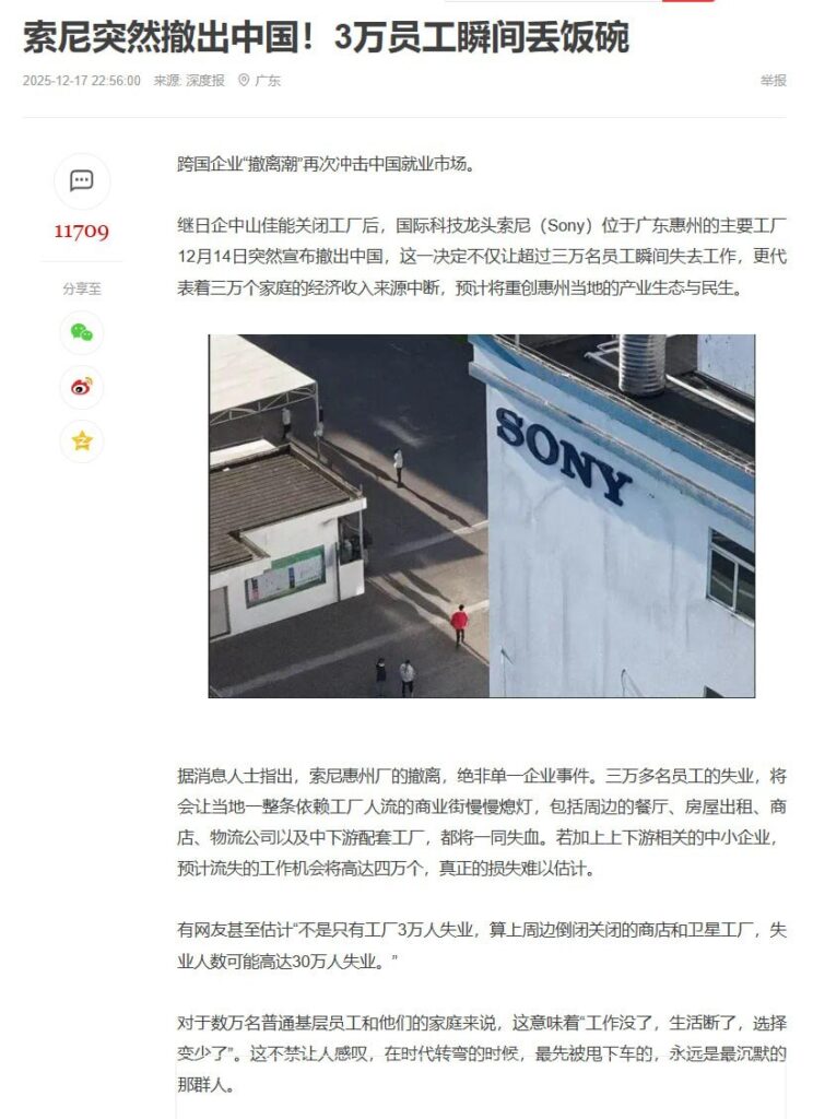 ソニーが広東省恵州の主力工場の閉鎖、中国からの撤退を発表。