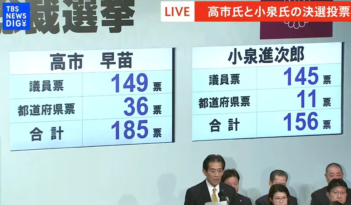 結果は高市早苗候補が党員票、地方票で圧倒し、