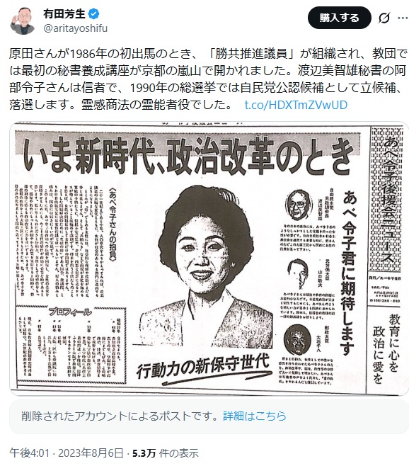 原田さんが1986年の初出馬のとき、「勝共推進議員」が組織され、教団では最初の秘書養成講座が京都の嵐山で開かれました。渡辺美智雄秘書の阿部令子さんは信者で、1990年の総選挙では自民党公認候補として立候補、落選します。霊感商法の霊能者役でした。