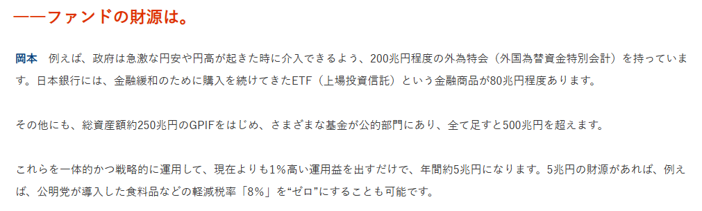 ・政府の基金を財源にしてジャパンファンドを創設して食料品消費税ゼロとか社会保障負担軽減をするよ