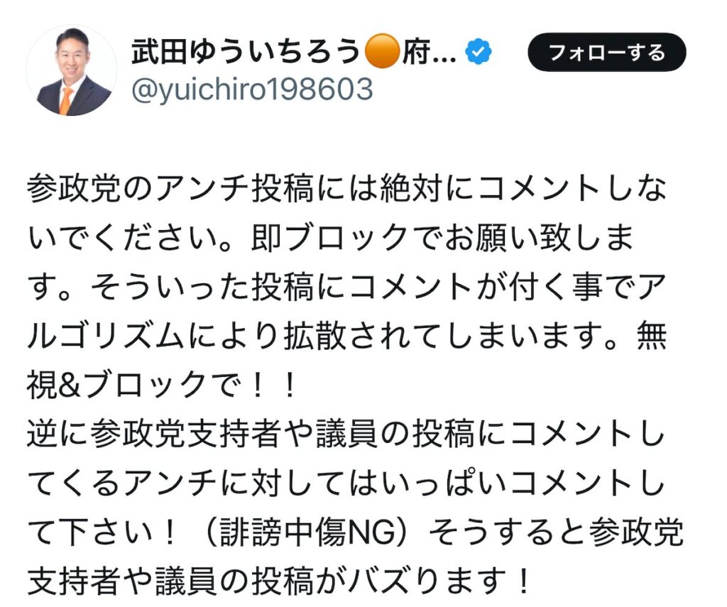逆に参政党支持者や議員の投稿にコメントしてくるアンチに対してはいっぱいコメントして下さい!