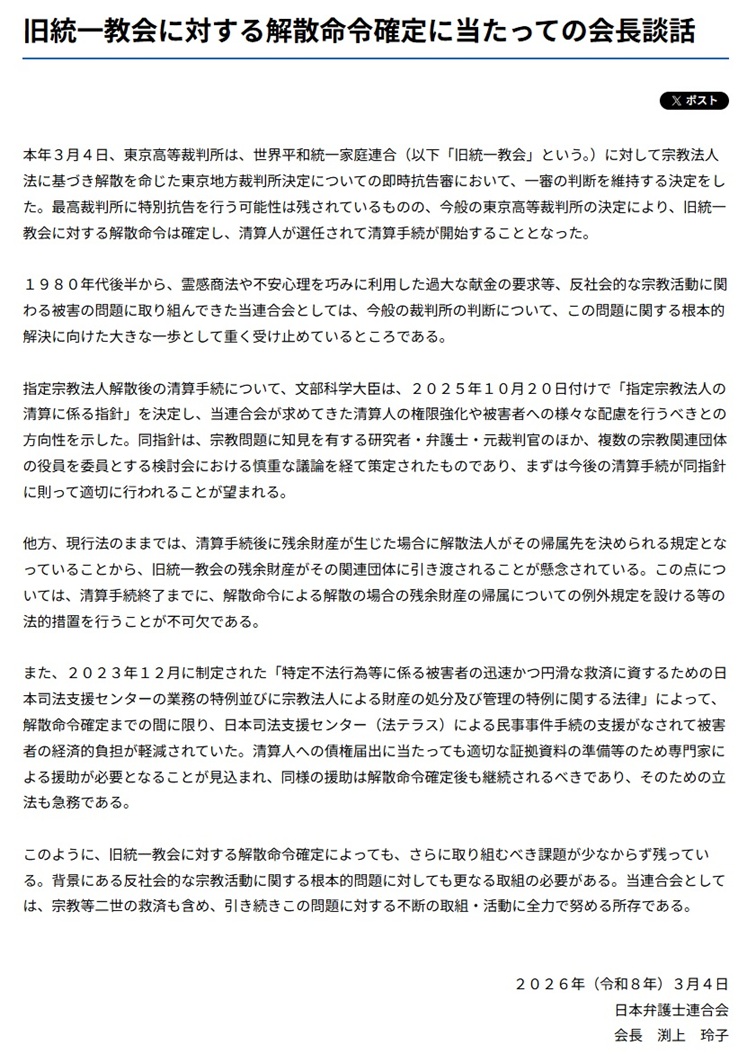 先日の東京高裁での旧統一教会への解散命令裁判について