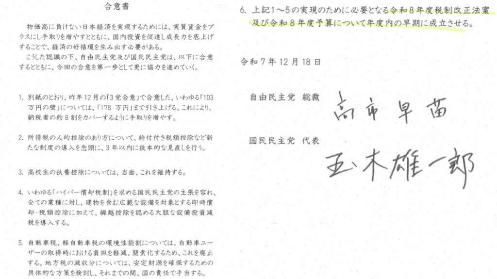 ・12月18日に与党と合意をし覚書を交わし、高市内閣はこの合意内容を実行するために動くも予算の年度内成立に協力する約束を反故にする国民民主党