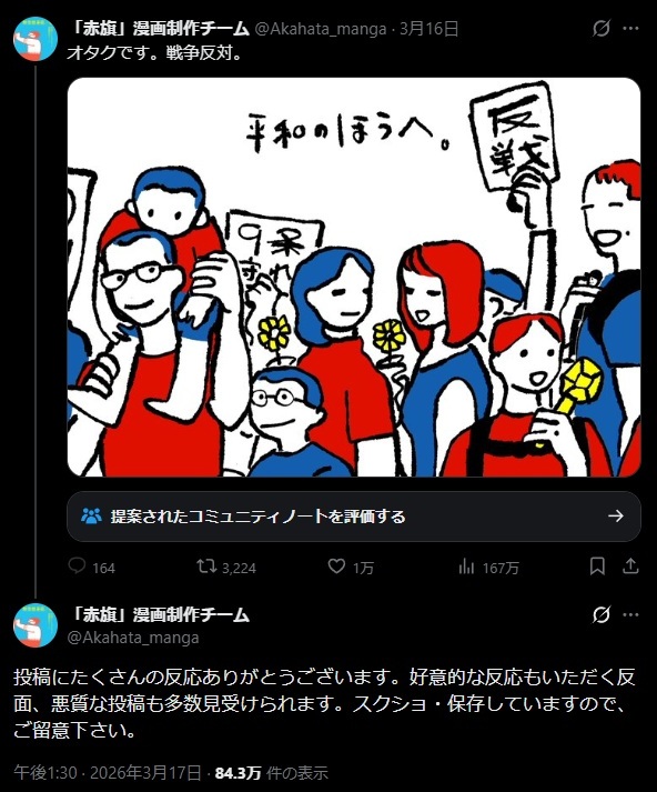 投稿にたくさんの反応ありがとうございます。好意的な反応もいただく反面、悪質な投稿も多数見受けられます。スクショ・保存していますので、ご留意下さい。