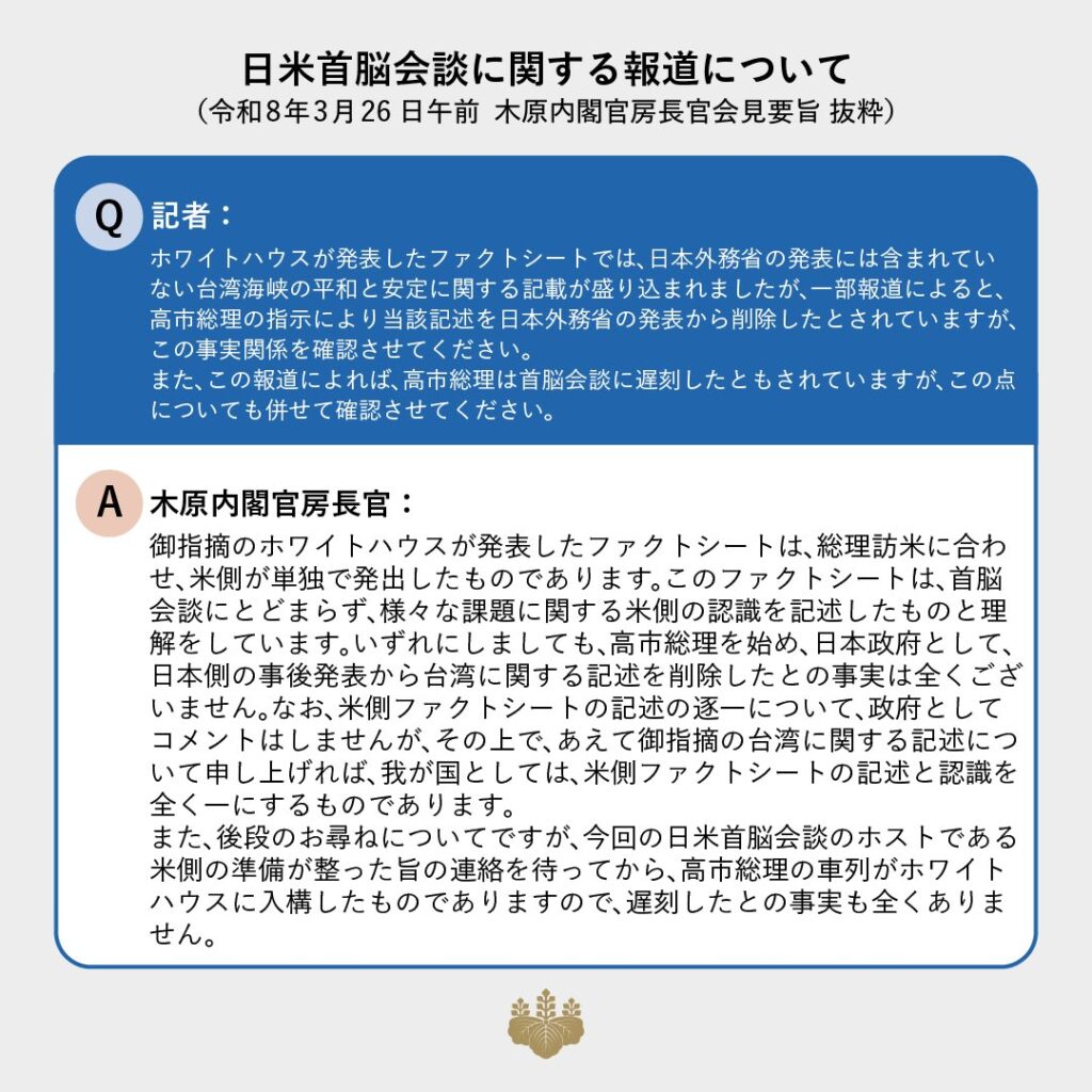 ホワイトハウスが発表したファクトシートでは、日本外務省の発表には含まれていない台湾海峡の平和と安定に関する記載が盛り込まれましたが、一部報道によると、高市総理の指示により当該記述を日本外務省の発表から削除したとされていますが、この事実関係を確認させてください。