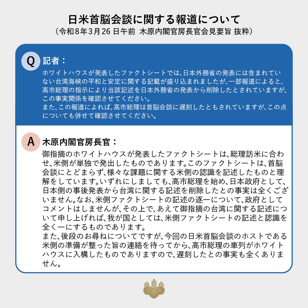 また、後段のお尋ねについてですが、今回の日米首脳会談のホストである米側の準備が整った旨の連絡を待ってから、高市総理の車列がホワイトハウスに入構したものでありますので、遅刻したとの事実も全くありません。