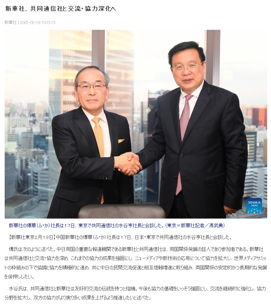 【新華社東京2月18日】中国新華社の傅華(ふ・か)社長は17日、日本・東京で共同通信社の水谷亨社長と会談した。