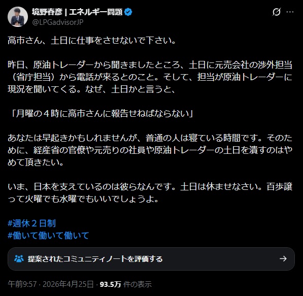 あなたは早起きかもしれませんが、普通の人は寝ている時間です。そのために、経産省の官僚や元売りの社員や原油トレーダーの土日を潰すのはやめて頂きたい。